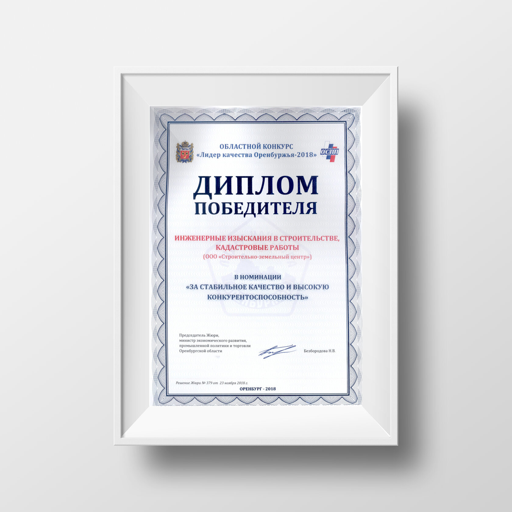 Диплом победителя «Лидер качества Оренбуржья 2018»